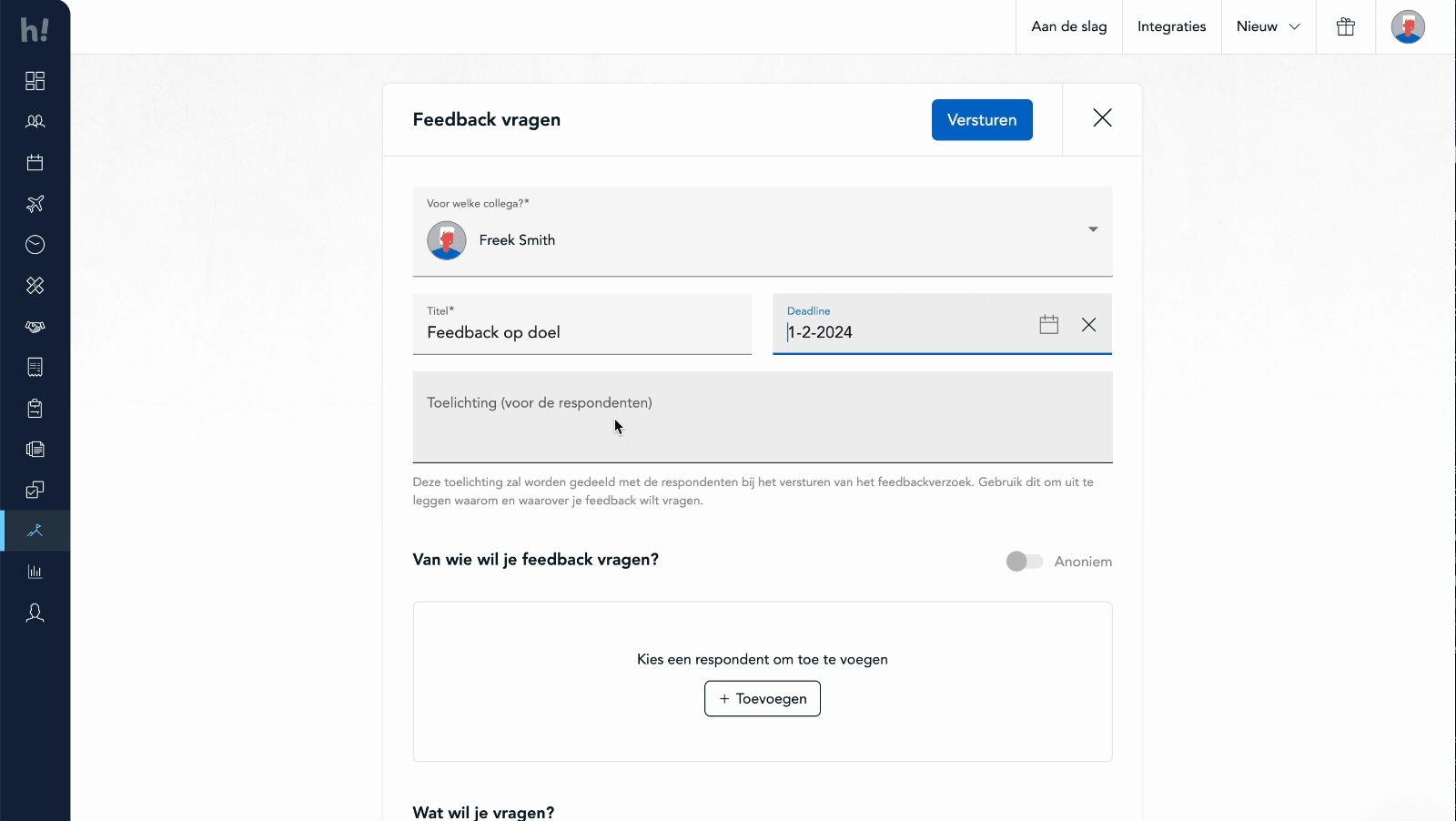 Let op: standaard kunnen medewerkers zelf geen feedback uitvragen. Zo kun je eerst zelf de vragenlijsten voorbereiden. Je activeert dit als beheerder via Bedrijfsinstellingen > Ontwikkeling.