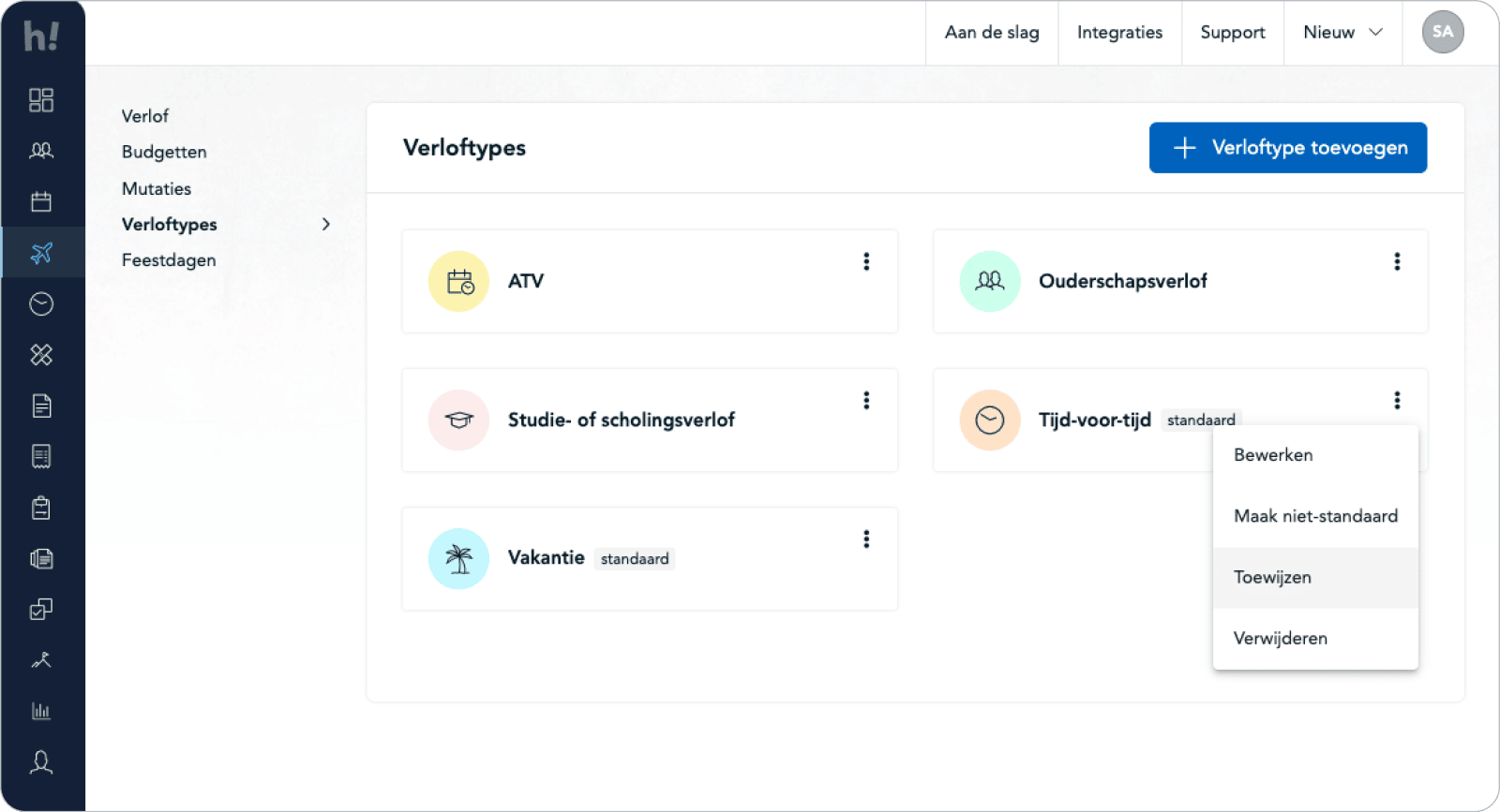 Alles is aanpasbaar en HoorayHR helpt je uiteraard op weg om de standaard regels goed te volgen. Een verloftype wijs je vervolgens toe aan een of meerdere collega’s waarbij je direct de mogelijkheid hebt om eventuele afwijkingen per medewerkers aan te geven.