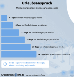 Wie viele Urlaubstage stehen dir laut Gesetz eigentlich zu? Der Urlaubsanspruch richtet sich nach der Anzahl der Arbeitstage pro Woche und nach dem gesetzlichen Mindesturlaub gemäß Bundesurlaubsgesetz (BUrlG).