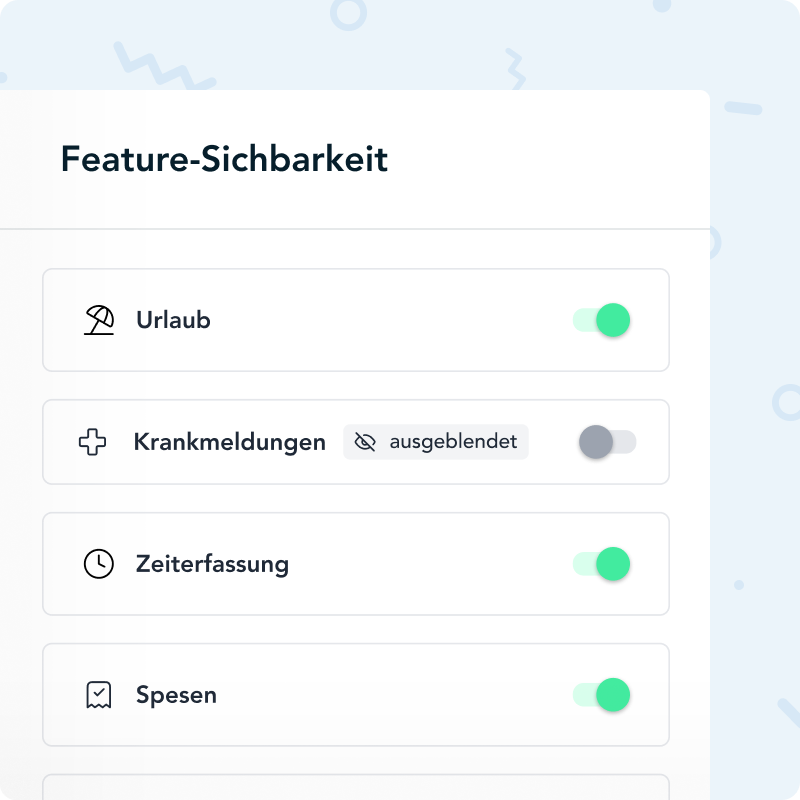 Feature-SichbarkeitPasse HoorayHR vollständig an deine Unternehmensstruktur an. Möchtest du verhindern, dass Mitarbeitende bestimmte Features nutzen? In HoorayHR kannst du Features ganz einfach für Mitarbeitende ausblenden.