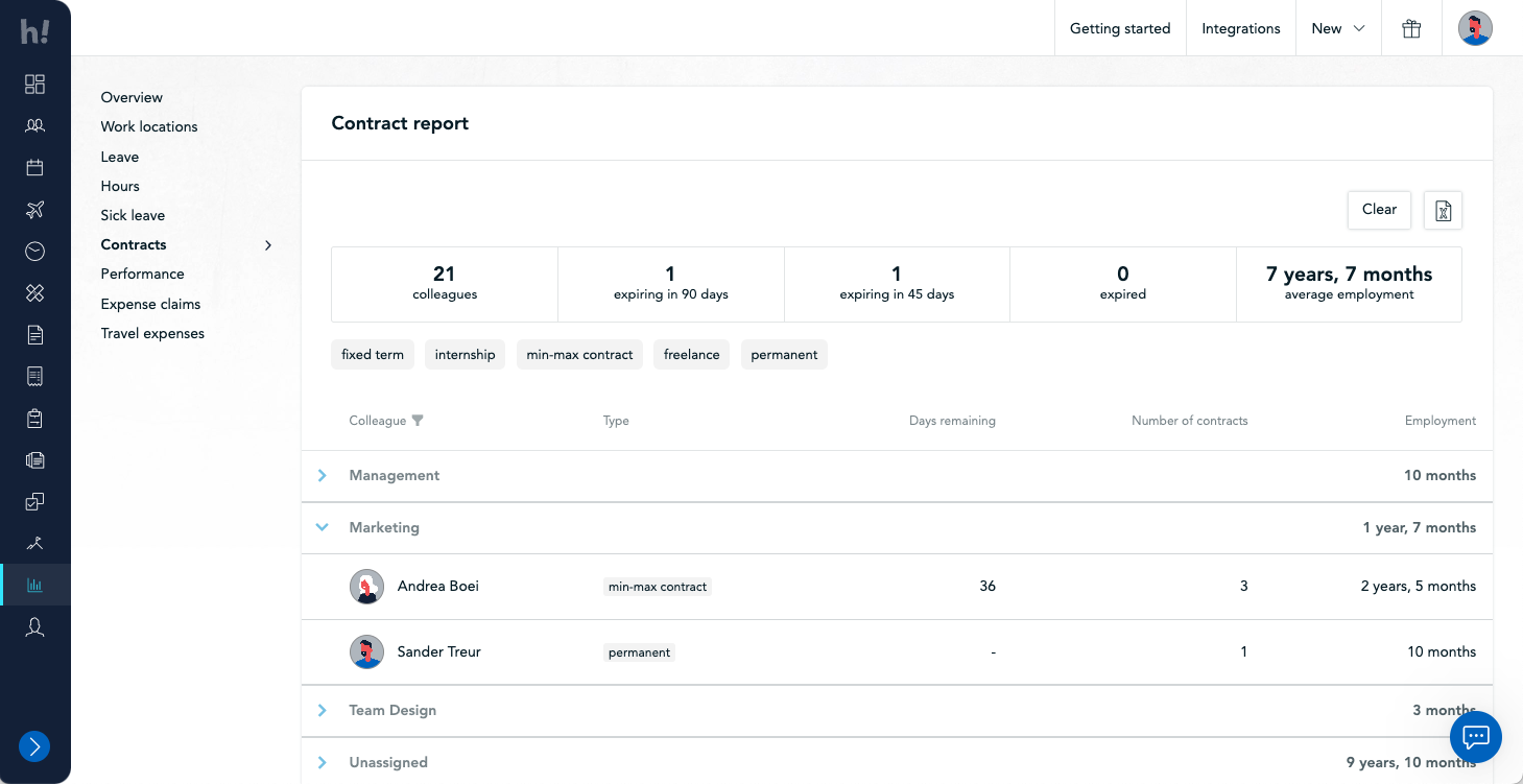 The reporting feature now includes a report specifically for contracts within the company. In one overview, you can see which contracts are expiring or expired for the entire company, each team, and each individual. You can also see the average length of service for your employees and the number of contracts each employee has had. In this report, you can filter based on contract types (labels) as well.