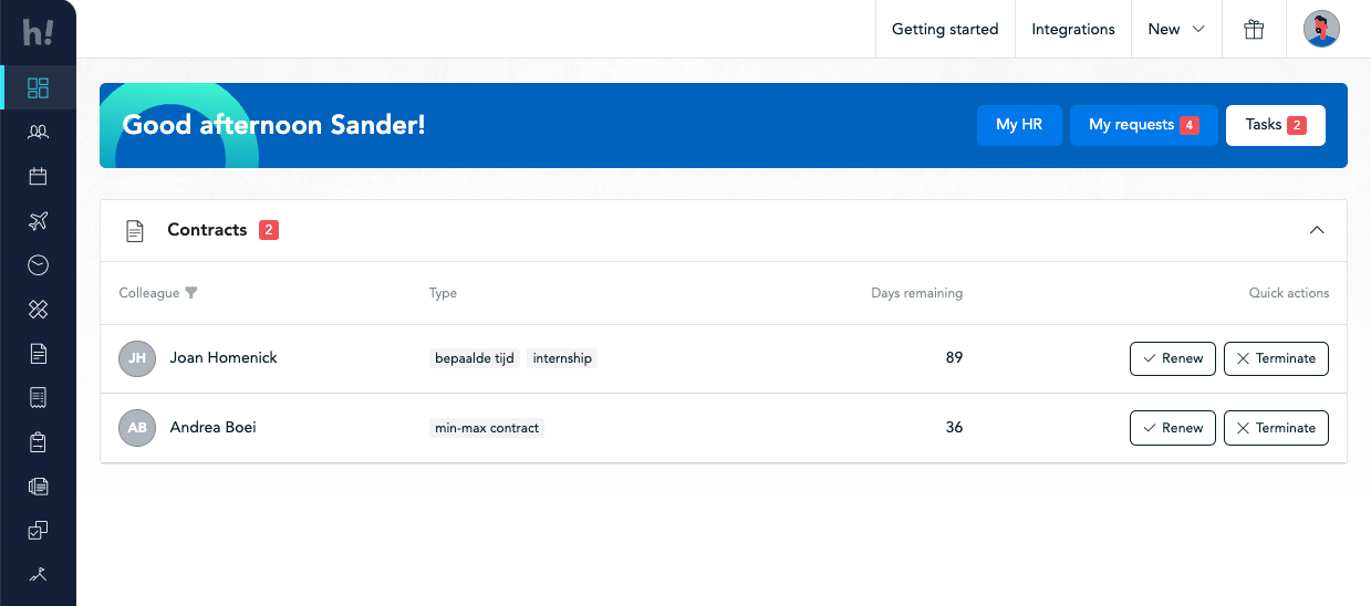 We have added expiring contracts to the task screen in your dashboard. If a contract is expiring within 90 days, it will appear in your overview. You can then choose to renew or terminate the contract. Once you’ve taken action, the contract will automatically disappear from your overview. Handy!