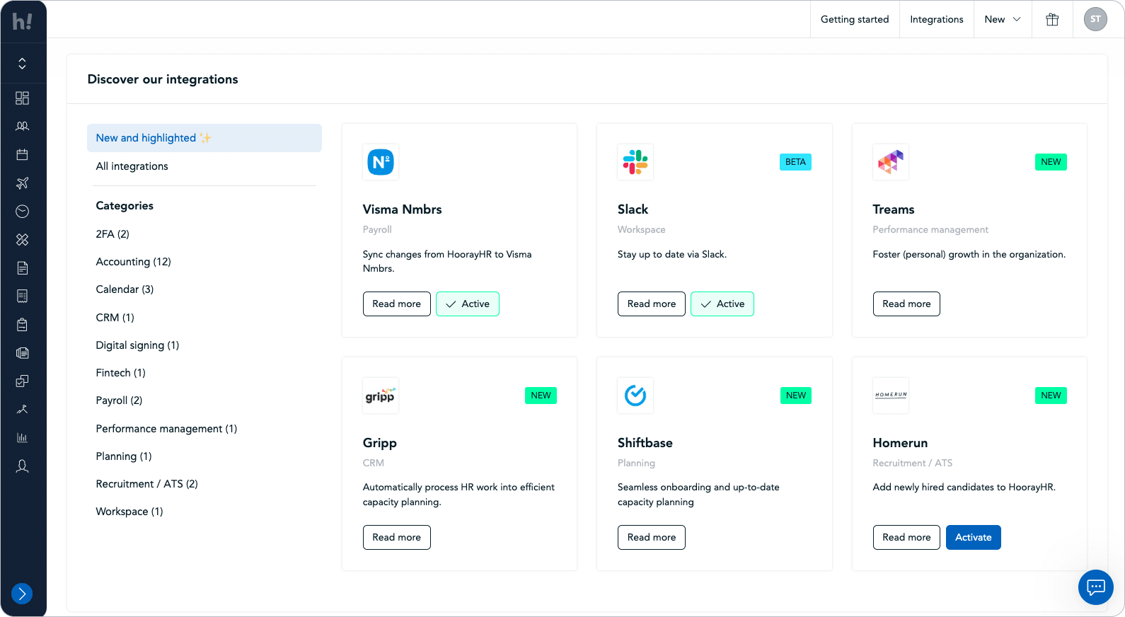 When you log in to your HoorayHR account, you can find the integration store under the “Integrations” section. Here, you can see an overview of all available integrations. From here, you can get more information about the integration and its capabilities, or activate the integration directly. Of course, you can also view the integrations directly on our website.