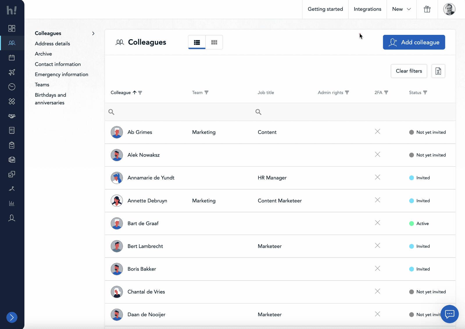 To get an overview of who has administrator rights to certain features, the colleague overview has been expanded. Here you can see at a glance which colleagues have administrator rights. Filtering is also possible, to see even more easily a list of colleagues with, for example, administrator rights to the company assets feature.