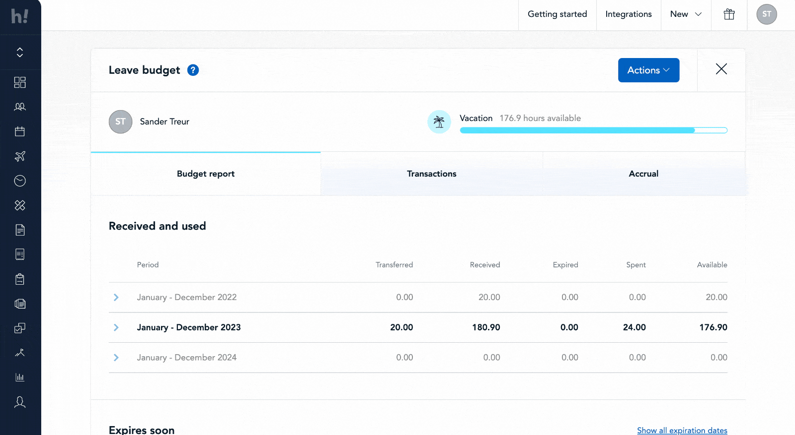 We have expanded the leave budget report with an extra tab: accrual. In this tab, you manage the settings for the accrual of the budget: how much budget does the employee get and from when do they receive it? Furthermore, on the leave report page, you can now directly request leave, add leave mutations, or end or delete the leave type for the employee via the actions button.
