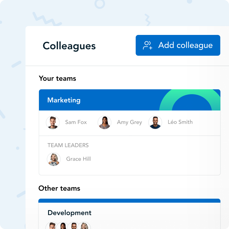 Setup teamsWith HoorayHR, you can easily organise your colleagues into teams. Gain insight into team performance and easily assign team leaders. The rights and roles for team leaders can be configured flexibly.