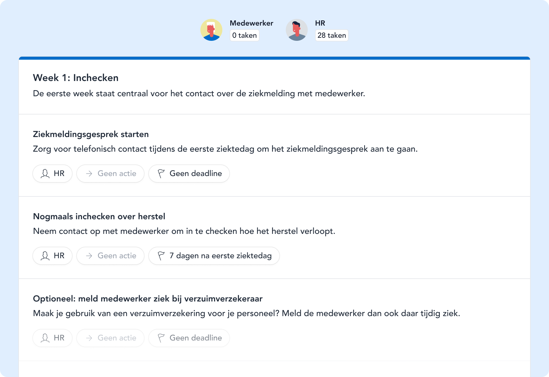 Met deze template, aangeboden door De Verzuimdokter, volg je stap voor stap het proces rondom langdurig verzuim volgens de Wet verbetering poortwachter (WvP). Het helpt je om tijdig en zorgvuldig alle verplichte acties vast te leggen – van de eerste ziekmelding tot aan re-integratie en eventuele WIA-aanvraag. Elke stap bevat duidelijke uitleg en ruimte voor verslaglegging, zodat je niets over het hoofd ziet en altijd inzicht houdt in de voortgang. Deze workflow is afgestemd op de wettelijke richtlijnen en biedt houvast voor HR en werkgevers bij het begeleiden van zieke medewerkers. Praktisch, overzichtelijk en direct inzetbaar – zodat je voldoet aan je verplichtingen én gericht werkt aan verantwoorde re-integratie.